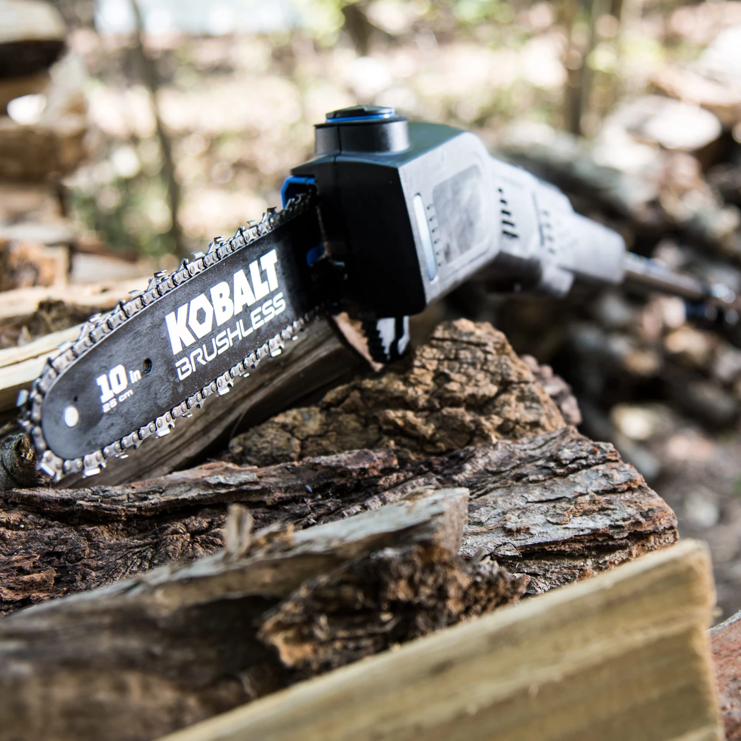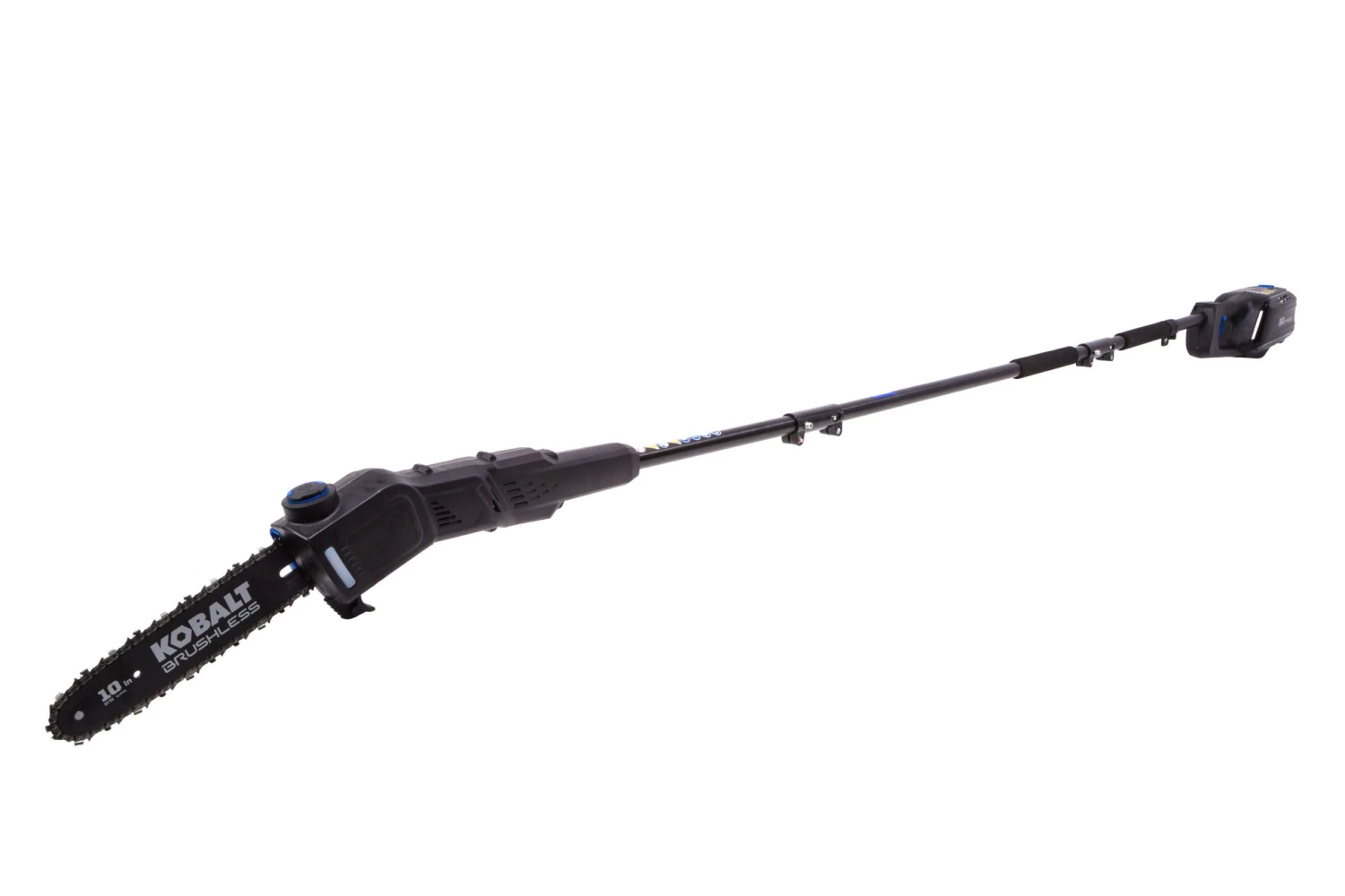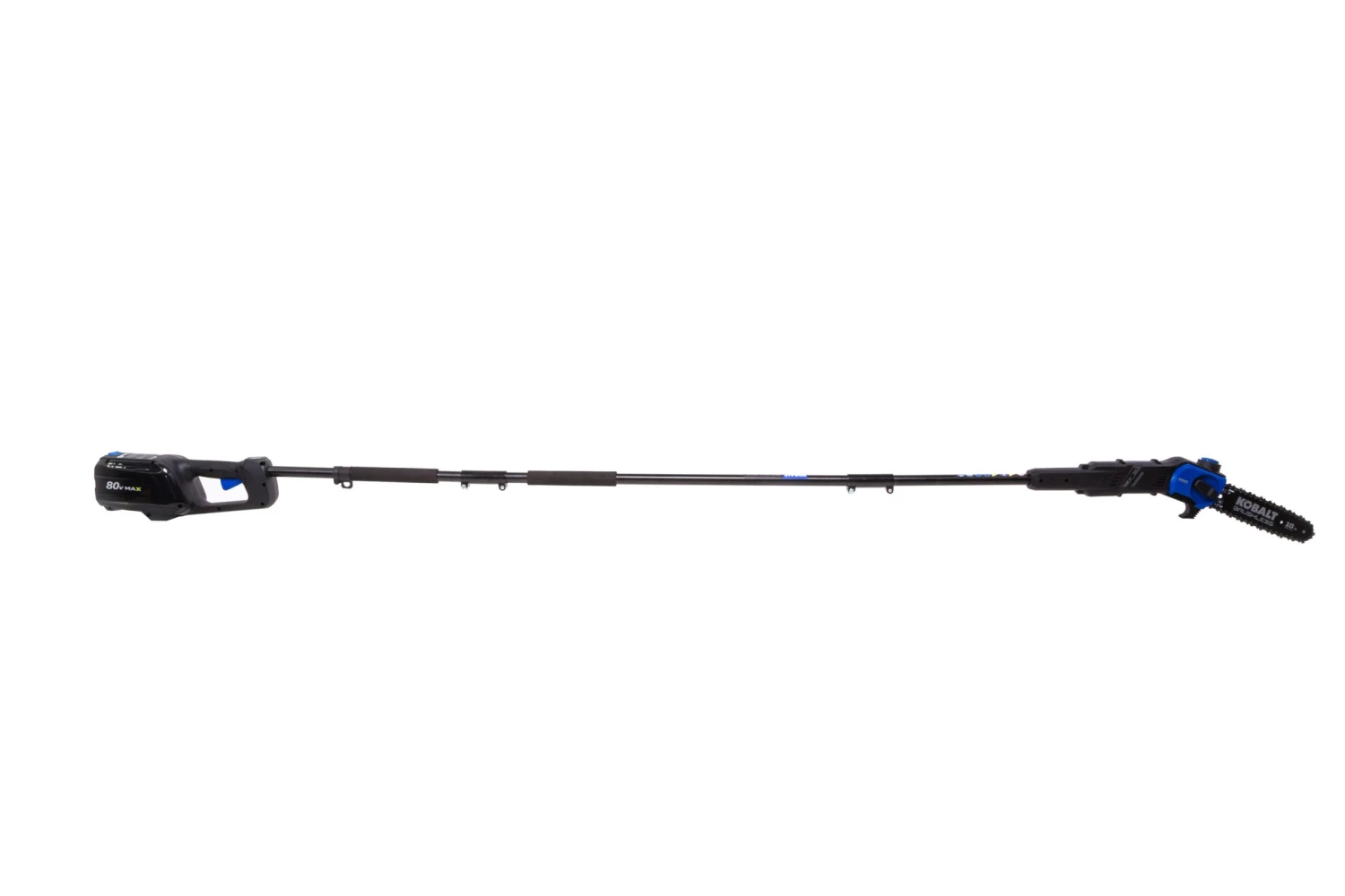- Kobalt 80V max pole saw with battery (sold separately) offers the maximum power of our highest voltage, the 10-in bar and chain will cut through the toughest branches and limbs with ease, add on the included 8-ft extension pole to reach higher areas