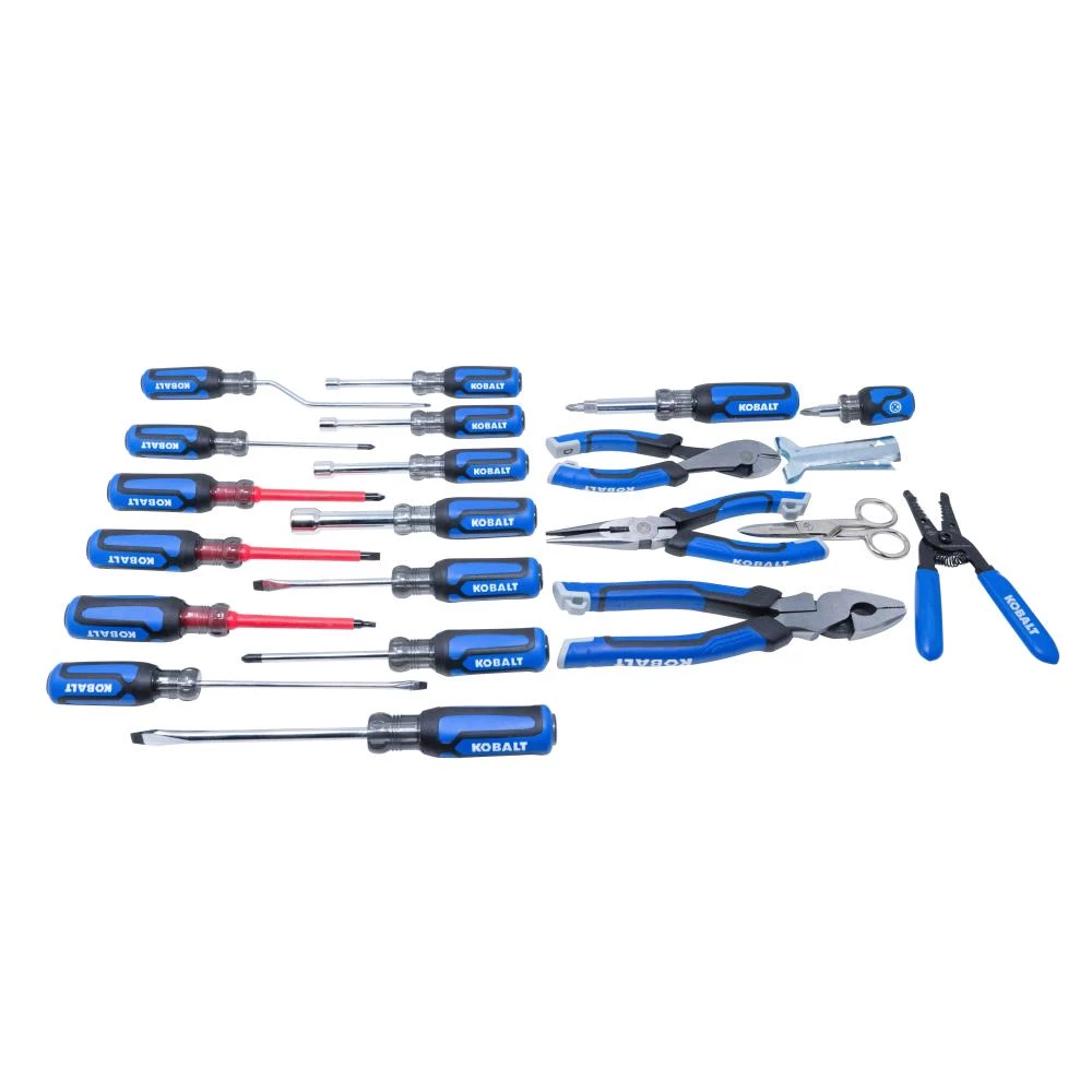 Kobalt’s huge 22-piece tool kit has all the right tools for almost any job you’ll encounter. Insulated screwdrivers provide extra protection for any fastener job. A well-crafted, versatile plier selection cuts and crimps any task. A smart selection of nut drivers make fastener tightening fast and easy. Handy electrician scissors are corrosion resistant and have precision ground blades for efficient and precise cutting. Wire stripper blades are precision ground for clean, accurate stripping. Keep your Kobalt 22-piece tool kit organized and ready to take anywhere with the durable nylon tool bag. A great value full of well-built, professional tools.