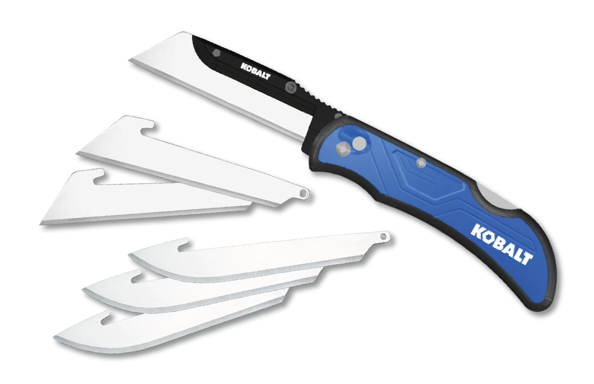 The 3-in Folding Razor Utility Knife from Kobalt delivers nearly 3 times the cutting edge of a standard utility knife, making it a significant upgrade and the perfect companion for the seasoned contractor or DIY enthusiast. The knife comes complete with three interchangeable 3.0” utility blades and three 3.0” drop-point blades to go from work to play with the push of a button. The razor blades are constructed from 420J2 stainless steel and are hand sharpened. As blades go dull, simply push the lock button on the handle to remove the dull blade and insert a shaving sharp new one. The black blade support provides the thin razor blades with the strength and rigidity of a standard knife. The ergonomic handle is constructed from durable fiberglass reinforced nylon with rubberized inserts for a non-slip grip. Open the knife with one hand using the double sided thumb studs and carry it securely in your pocket with the stainless steel pocket clip. This knife is ready to work and willing to tackle any cutting task at hand. This knife is compatible with Outdoor Edge’s 3.0 inch drop-point and utility RazorSafe replacement blade packs.