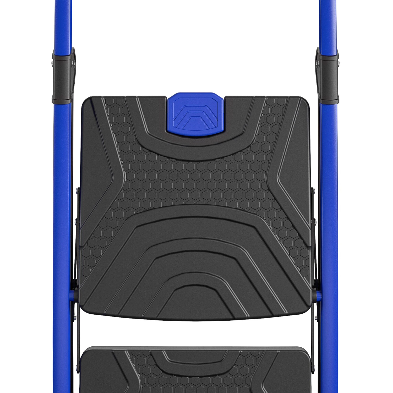 Designed for rough and tough dependability to help you get any project done. The strong steel frame and oversized steps combined with a 300 pound load capacity provides stability, comfort and safety as you work. Conveniently equipped with a built-in project top, perfect for holding your hardware and tools as you work. Rugged non-slip treads and large, non-marring feet will keep you feeling secure. Folds flat for easy transport and storage. Features an ANSI type 1A duty rating and a limited lifetime warranty.